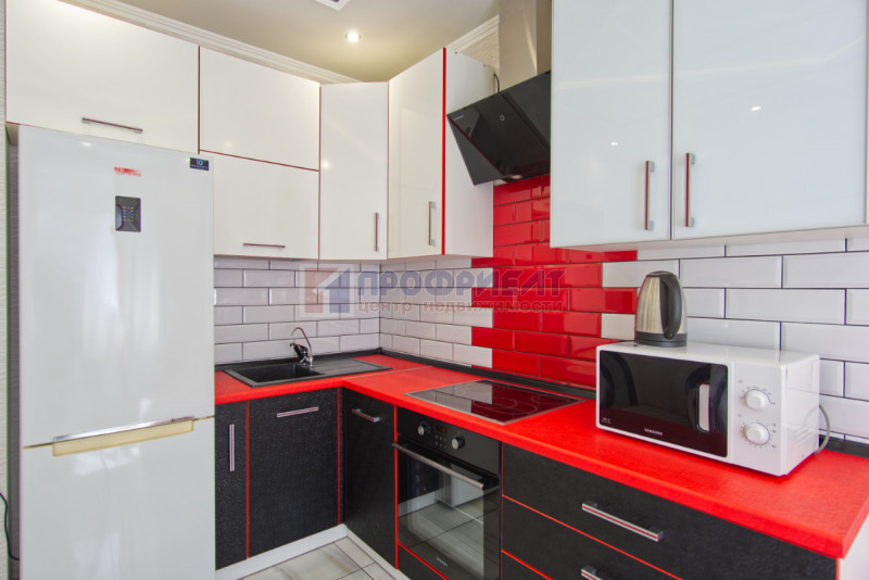 Общая площадь квартиры составляет 45,4 кв.м, а с утеплённым застеклённым балконом — 50,5 кв.м. Просторная кухня правильной квадратной формы (12,2 кв.м) станет сердцем дома. Здесь остаётся кухонный гарнитур, бытовая техника, установлен фильтр для питьевой воды и электрическая плита. Интерьер продуман: плитка на полу, многоуровневый потолок с точечными светильниками.